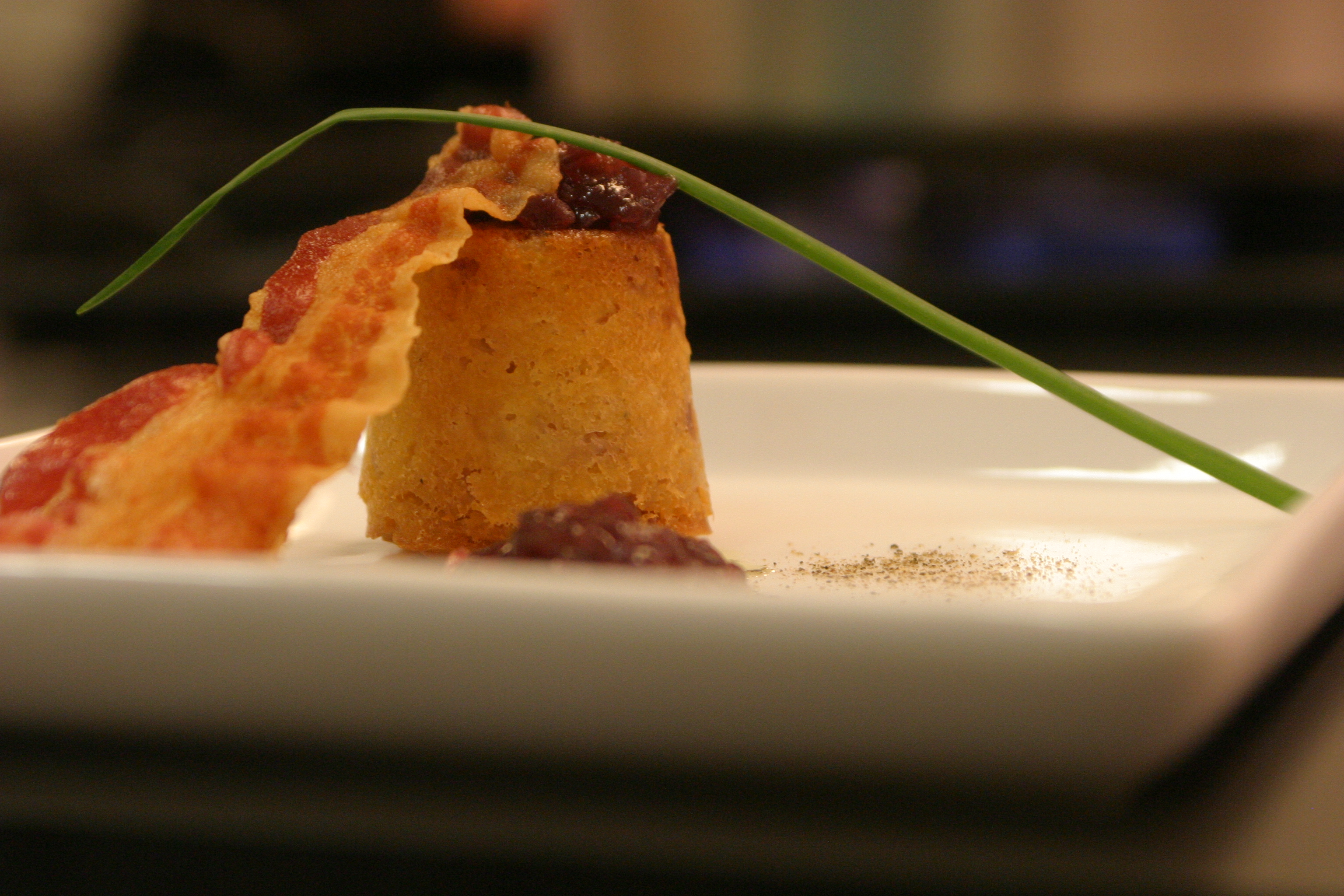 Guarnire con il restante bacon arrostito in padella, con la composta di cipolle e l’erba cipollina. Servire caldi.